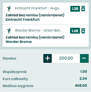 Zdumiewać powinno dopiero szesnastce miejsce w tabeli piłkarzy Floriana Kohfeldta. Werder ma kadrę, która powinna pozwolić mu zająć miejsce gwarantujące grę w pucharach, a tymczasem bremeńczyków czeka walka o utrzymanie. Wiosną pojawiają się jednak pierwsze promyki nadziei przed tygodniem długo prowadzili na wyjeździe z Augsburgiem i choć ostatecznie przegrali to pozostawili po sobie dobre wspomnienie. Przede wszystkim jednak rozpędzeni będą pucharowym zwycięstwem z Borussią Dortmund 3:2, co tylko potwierdziło, jak wielki potencjał tkwi w tym zespole. A gdyby potencjał i zapał nagle osłabły – gramy remis = zwrot.