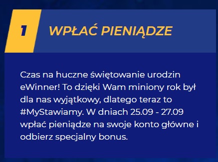 Dokonaj pierwszego depozytu za minimum 50PLN (pamiętaj ,że jeśli Twój pierwszy typ za 155PLN nie wejdzie – Ewinner zwraca Ci stawkę na Twoje konto główne które możesz wypłacić )