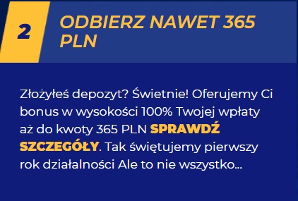 - Gracze, którzy dokonają wpłaty środków na betKonto w okresie od 25.09.2020 godz. 00:01 do 27.09.2020 godz. 23:59 otrzymają bonus w wysokości 100% wpłaconych środków, ale nie więcej niż 365 PLN.