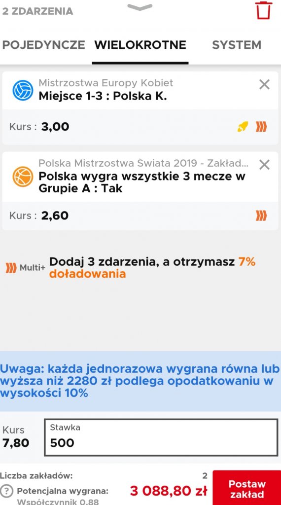 3. Postaw na to że Polskie Siatkarki zdobędą medal i że Polscy Koszykarze wygrają 3 mecze grupowe za 500PLN – Jesli wejdzie wygrywasz 3088 PLN ! Jeśli jednak nie wejdzie 500PLN wraca na Twoje konto depozytowe – NIC NIE RYZYKUJESZ