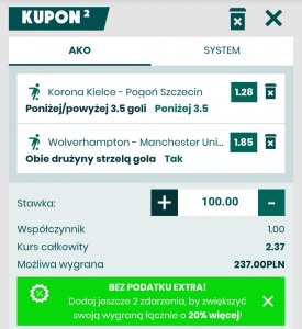 Wolves, rewelacja ostatniego sezonu, uczestnik Ligi Europy, pozostał w praktycznie niezmienionym składzie od poprzedniego udanego sezonu. Obecny sezon zaczął wyjazdem do Leicester – 0:0. Manchester, o ile w poprzednim sezonie znów zawiódł, to obecnie zaczął sezon przewyższając oczekiwania – 4:0 z Chelsea robi wrażenie (chociaż wynik nie oddaje w pełni wydarzeń boiskowych). Oba zespoły są ostatnio bardzo skuteczne (Wolves bardziej z ogórami w Lidze Europy) i oba stać na strzelenie bramki (Wolves u siebie stać na to z pewnością). Drużyny zwyczajowo strzelają sobie przynejmniej po bramce – 7/8 ostatnich spotkań to właśnie plusujący zakład BTTS. Kurs w naszej ocenie atrakcyjny – obie drużyny strzelą dziś bramkę.