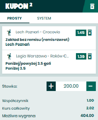 Kolejne zestawienie, gdzie faworytami są gospodarze. Legia odpadła już z Ligi Europy i będzie mogła w pełni skupić się na Ekstraklasie. Wojskowi pokonali ostatnio u siebie Zagłębie, zremisowali ze Śląskiem oraz wyewiezli 3 pkt z wyjazdu do innego beniaminka – ŁKS. Raków wraz z trenerem Papszunem zostali maksymalnie napompowani przez media przed sezonem i to powietrze uchodzi z dośc charakterystycznym dzwiękiem. Punktują okazyjnie, ale jak już punktują to z przytupem – 3 pkt zdobyte w meczu z Lechią, niestety w sierpniu przerżnęli wszystkie pozostałe mecze – Cracovia, Górnik, Lech. Skład Legii może zostać nieco wyrotowany po ciężkim boju w Glasgow i rezultat tutaj nie jest do końca jasny, ale jedno jest pewne – dużo bramek to tutaj nie zobaczymy. Raków przyjeżdża do Warszawy po 1 punkt i raczej skupią się na defensywie. Legia ma ogromne problemy ze zdobywaniem bramek. O ile trzecia bramka gdzieś może się wturlać, o czwartą będzie niezmiernie trudno.