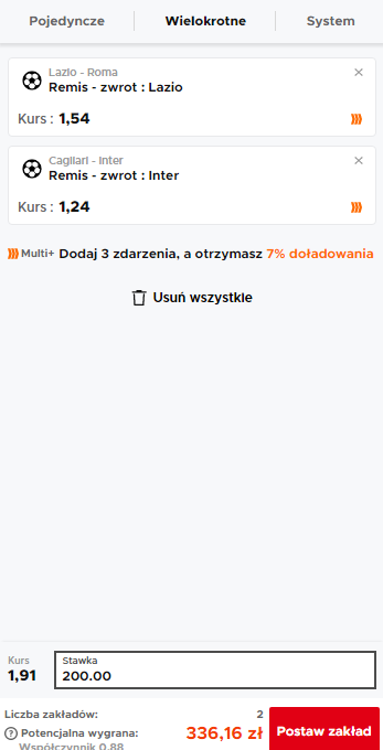 Po pewnym zwycięstwie z Lecce na inaugurację Inter Mediolan jedzie na meczdo Cagliari, które w pierwszej kolejsce przegrało z Brescią. Inter pod wodzą Antonio Conte wygląda dobrze. Ofensywa transferowa – Lukaku, Alexis Sanchez – przynosi swoje efekty. Obrońcom Cagliari może zabraknąc umiejętności, sił i ogólnie wszystkiego, aby skutecznie zapobiec stratom kolejnych bramek przez ten zespół. Włoscy eksperci upatrują w Interze w tym sezonie poważne zagrożenie dla Juve i trzecią, po Napoli siłę w walce o scudetto. Czy słusznie? Czas pokaże. Nawet gdyby Interowi podwinęła się noga i zdarzyło się gorsze spotkanie mamy w tym zakładzie ubezpieczenie od remisu.